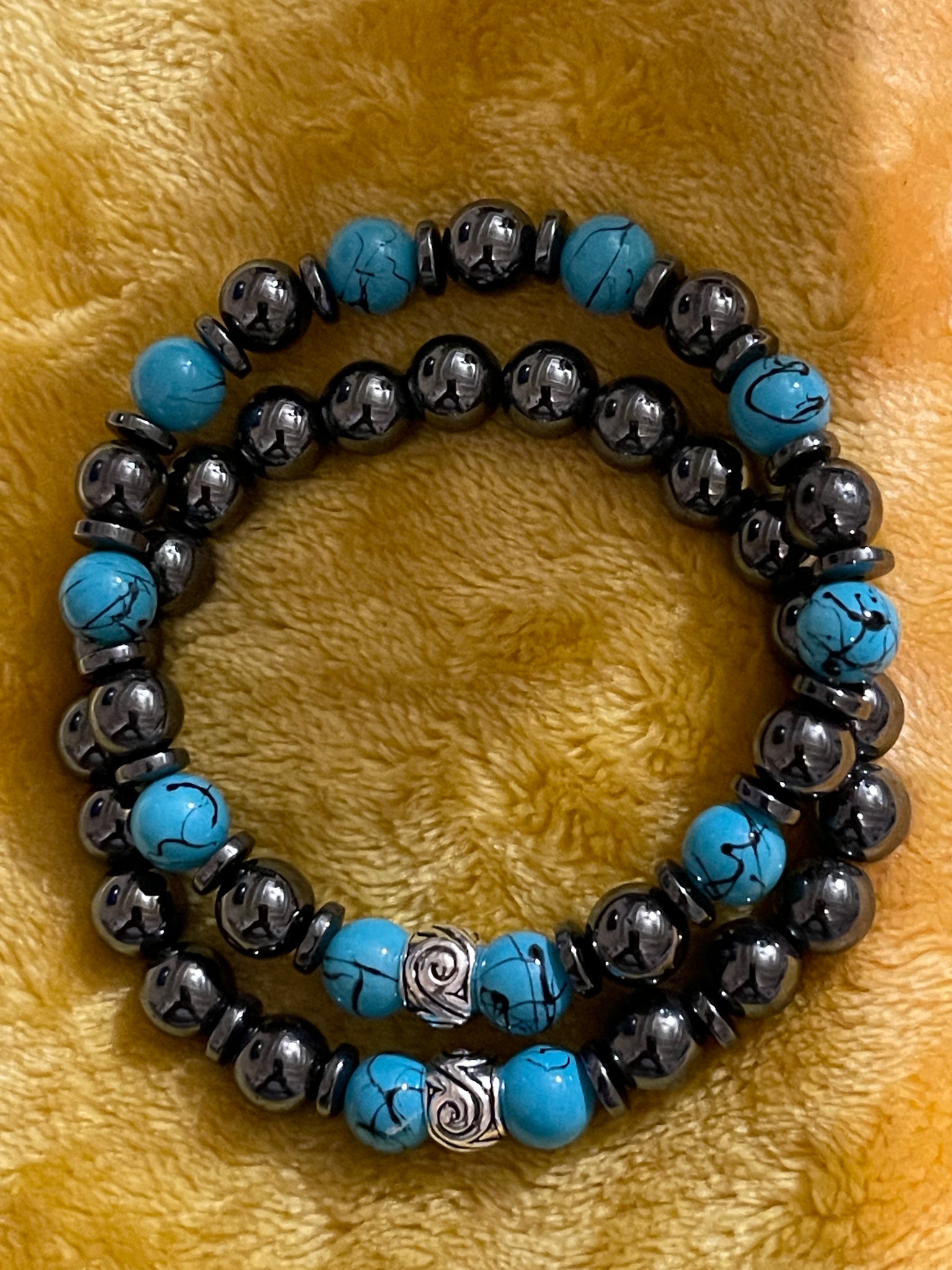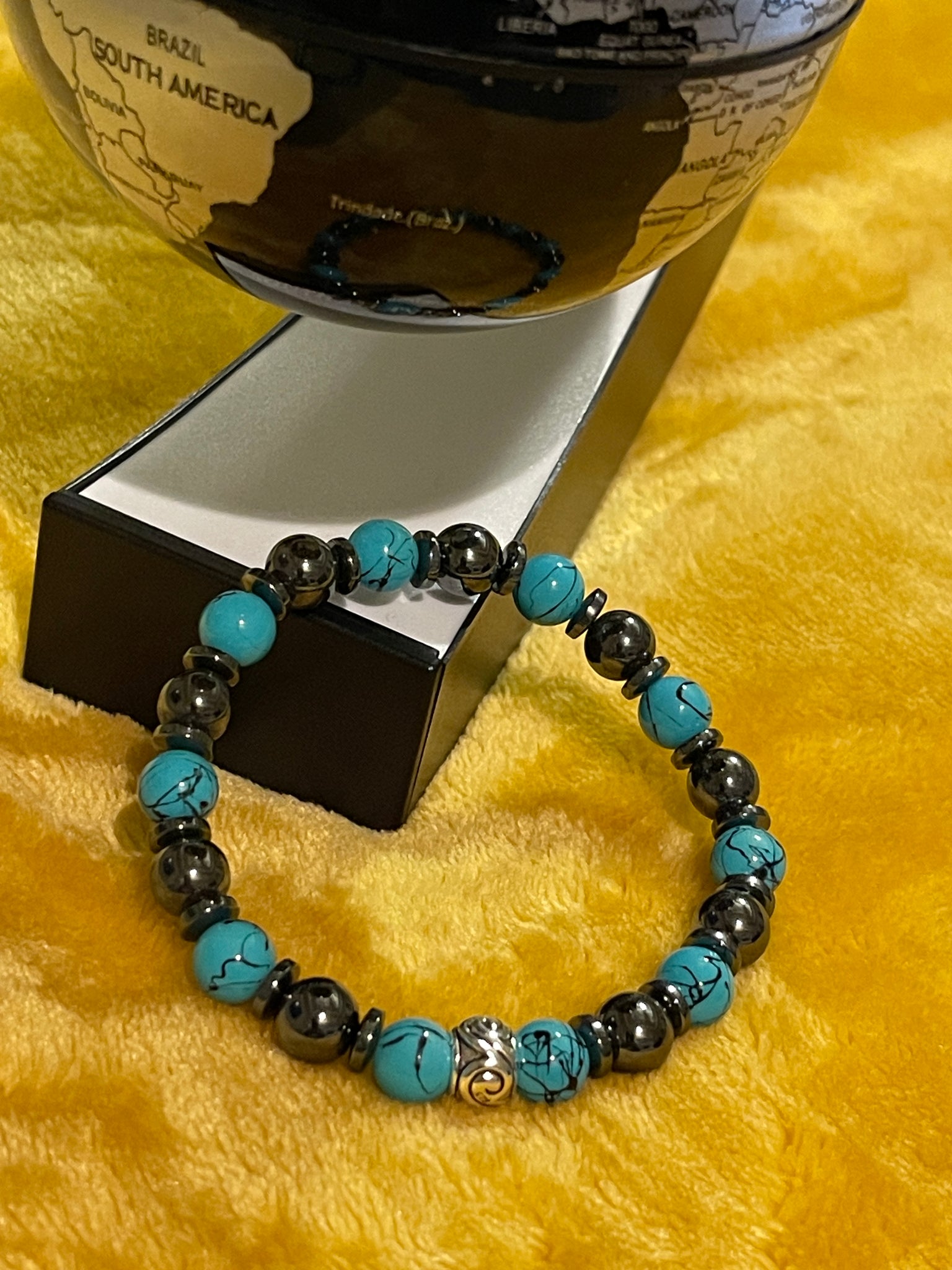 Ladies 8mm Blue Turquoise/Hematite/925 Sterling Silver Beaded Bracelet, 7.5in
